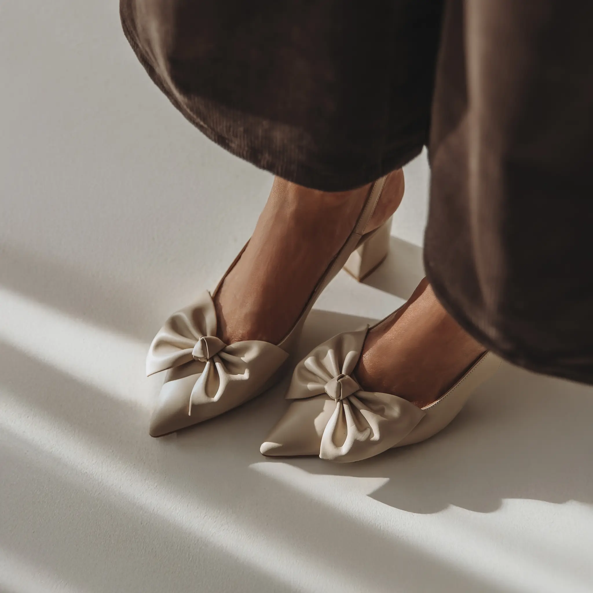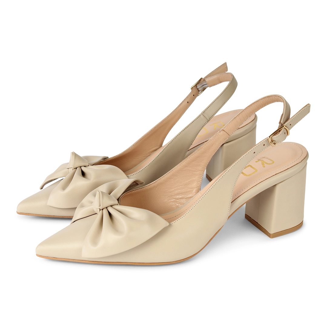 Pump DALLAS BEIGE van beige leer met slingback en grote strik op de neus. Leer gevoerd, zacht voetbed en stevige 6 cm blokhak.