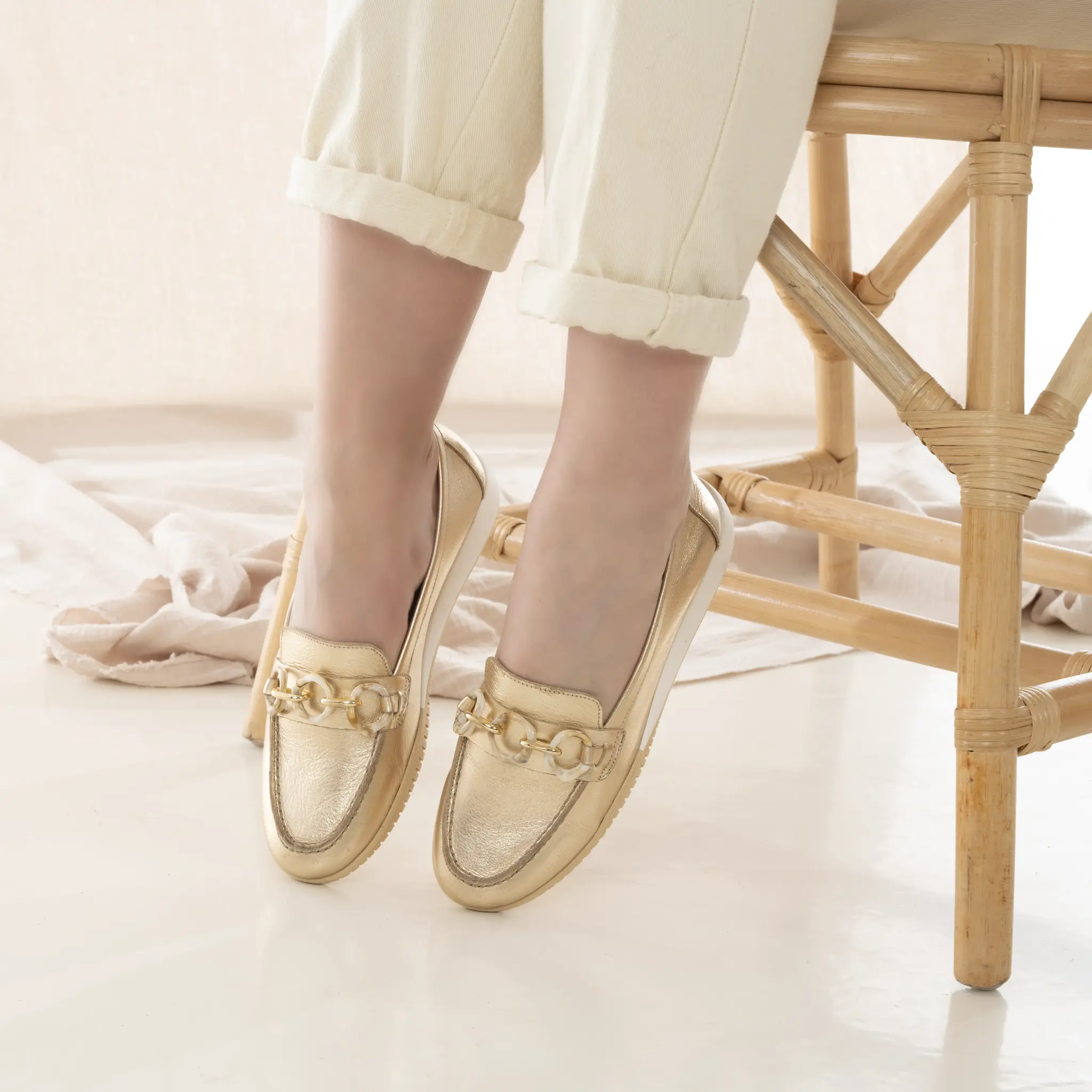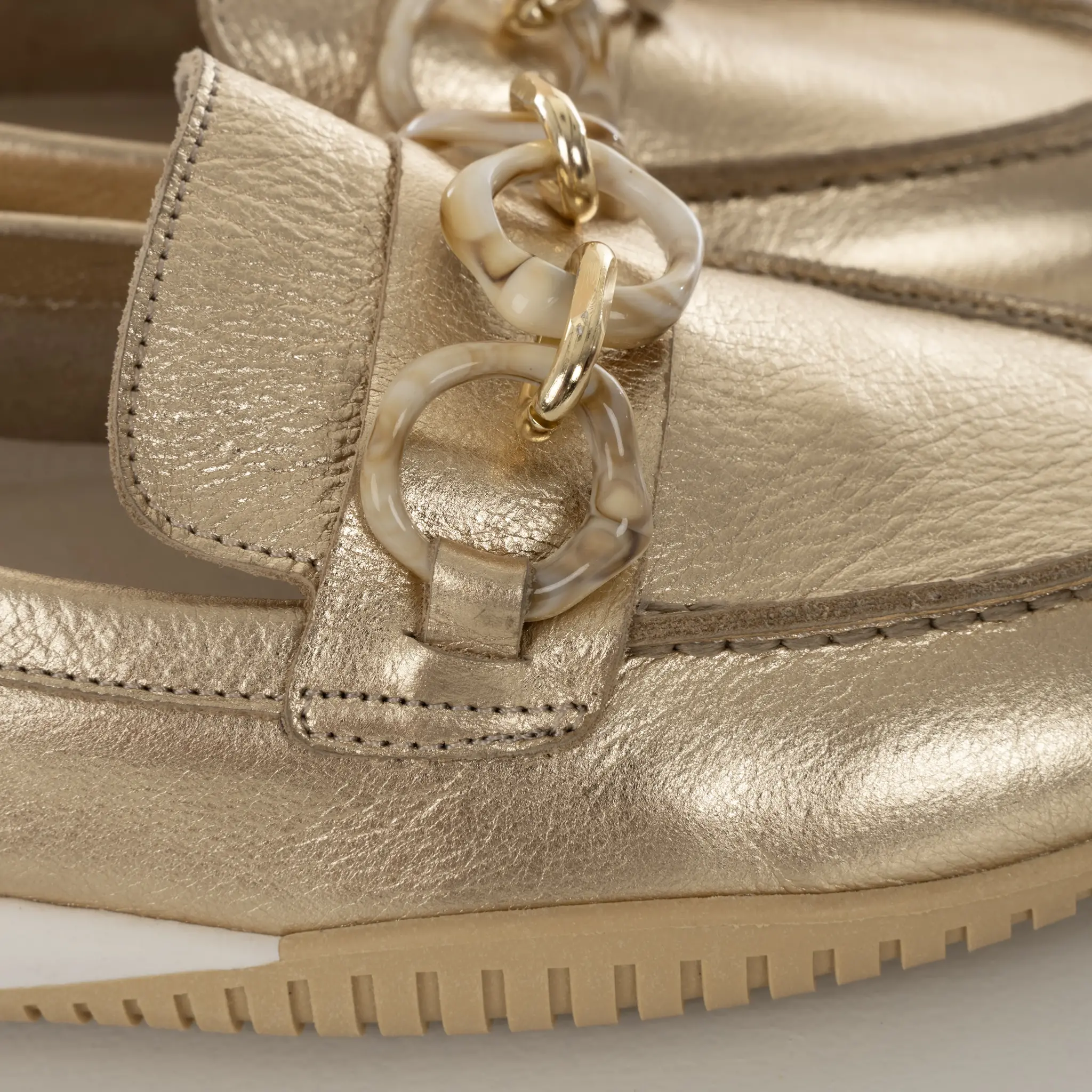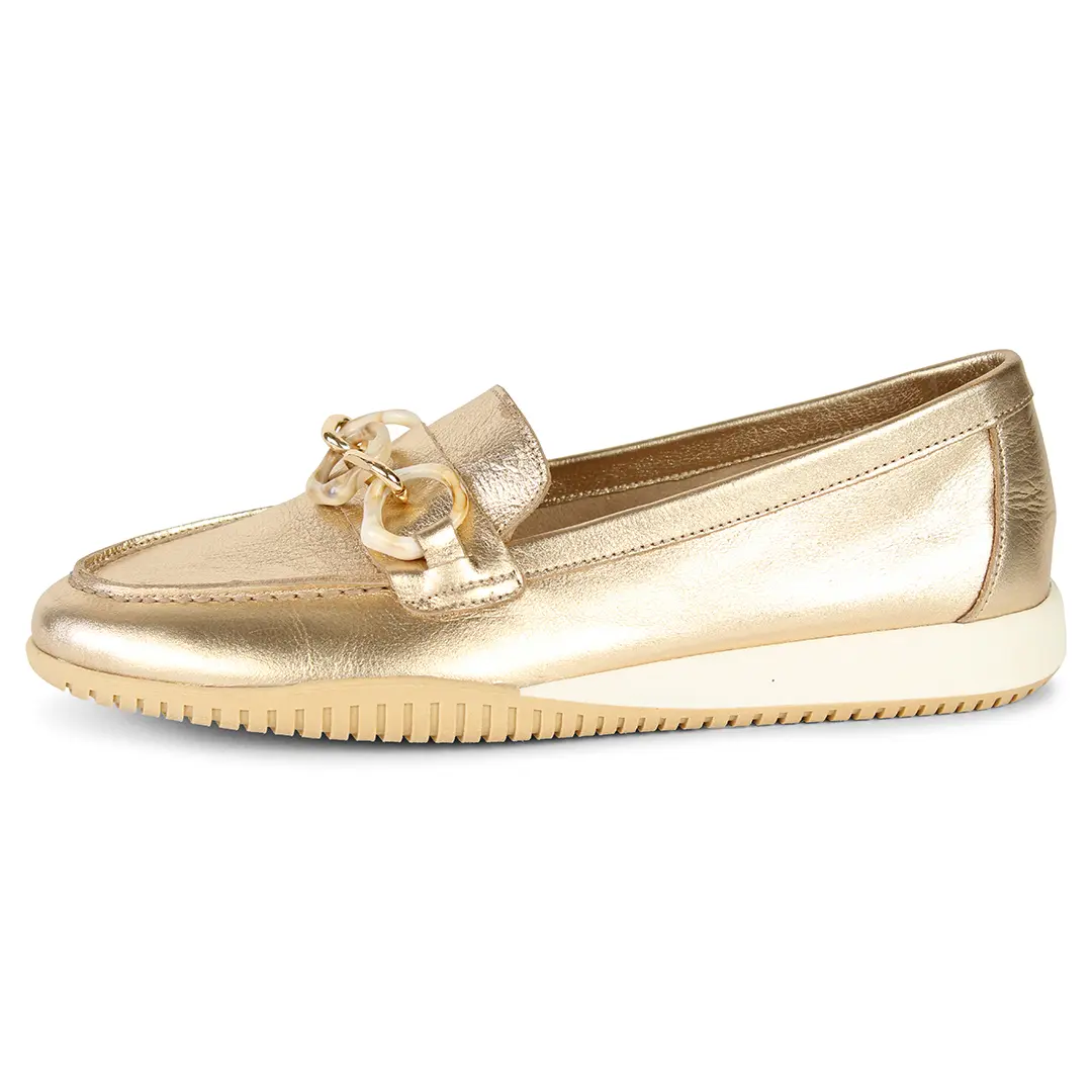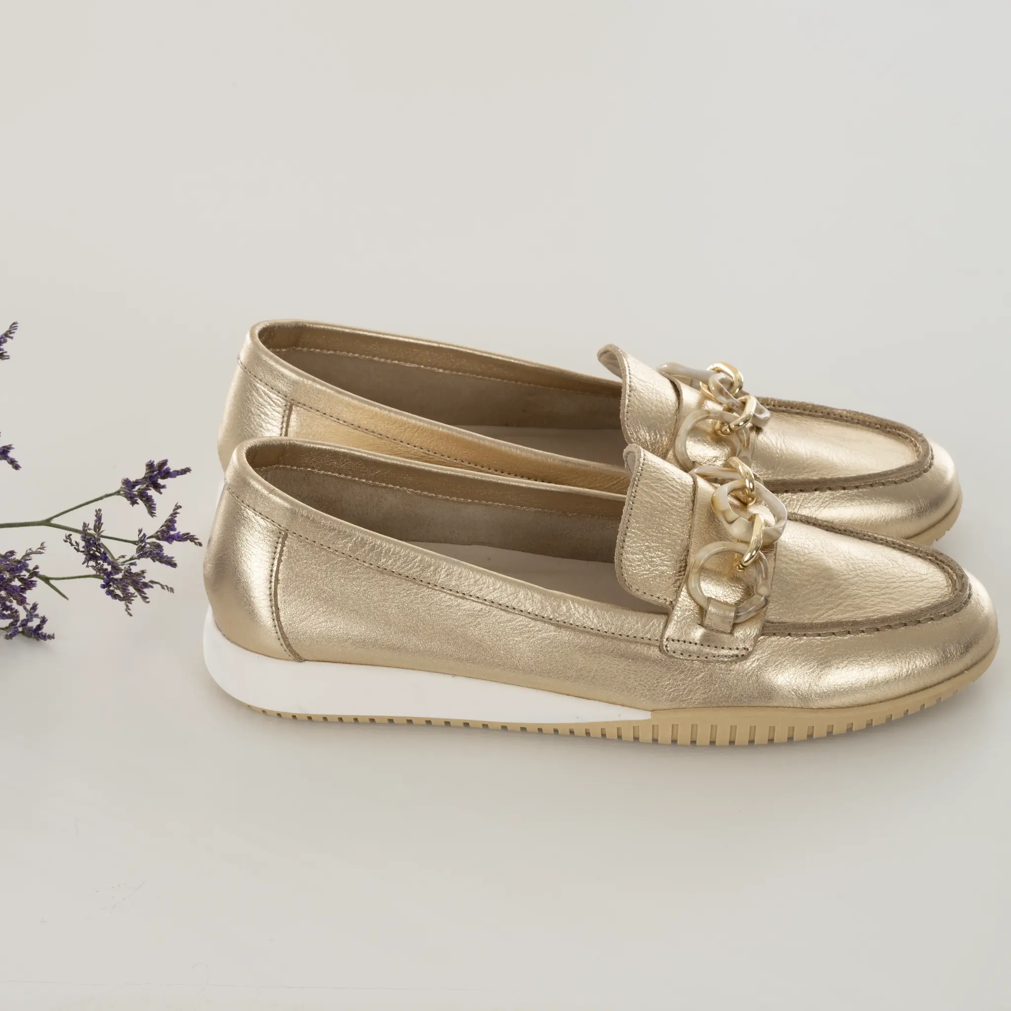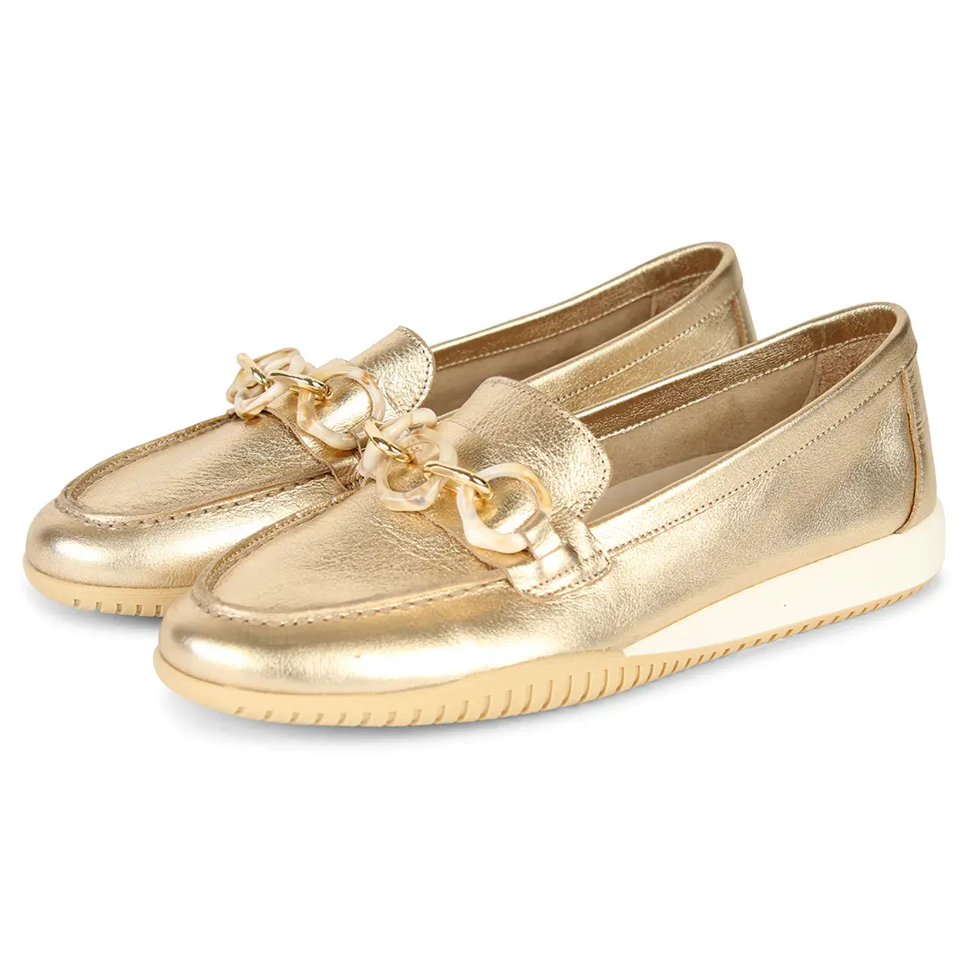 Deze stijlvolle loafer van Roberto D’Angelo combineert elegantie en comfort in een verfijnd Italiaans design. De schoen is uitgevoerd in een luxueuze metallic gouden kleur, waardoor hij een chique en mod
