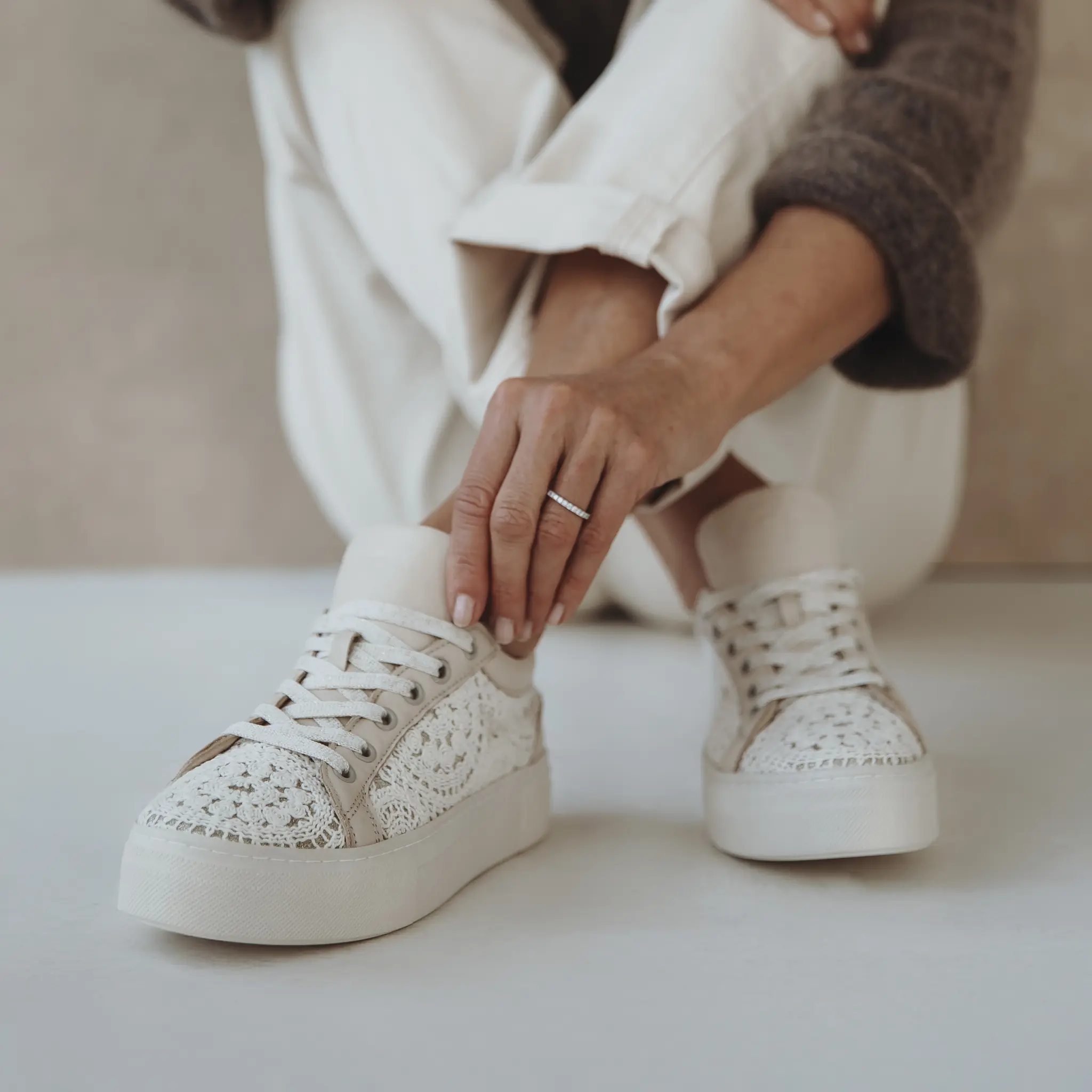 De HOPI is een opvallende en vrouwelijke sneaker met een unieke, modische uitstraling. Dit model is uitgevoerd in beige leer, gecombineerd met een fijn opengewerkt textiel met bloemendessin, wat zorgt voor een luchtige en zomerse look.