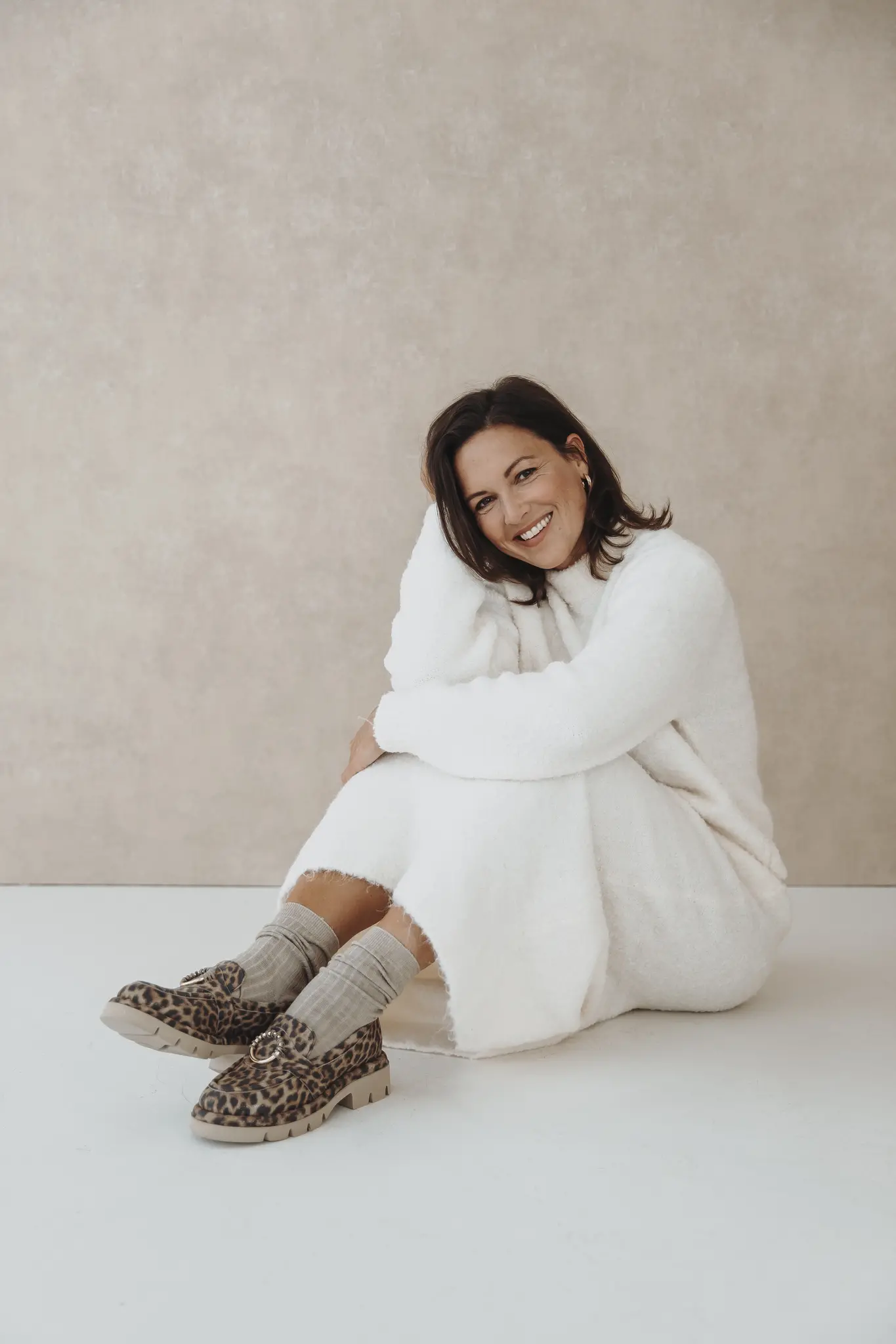 - Upper: leren panterprint in zacht camel met subtiel rond accessoire