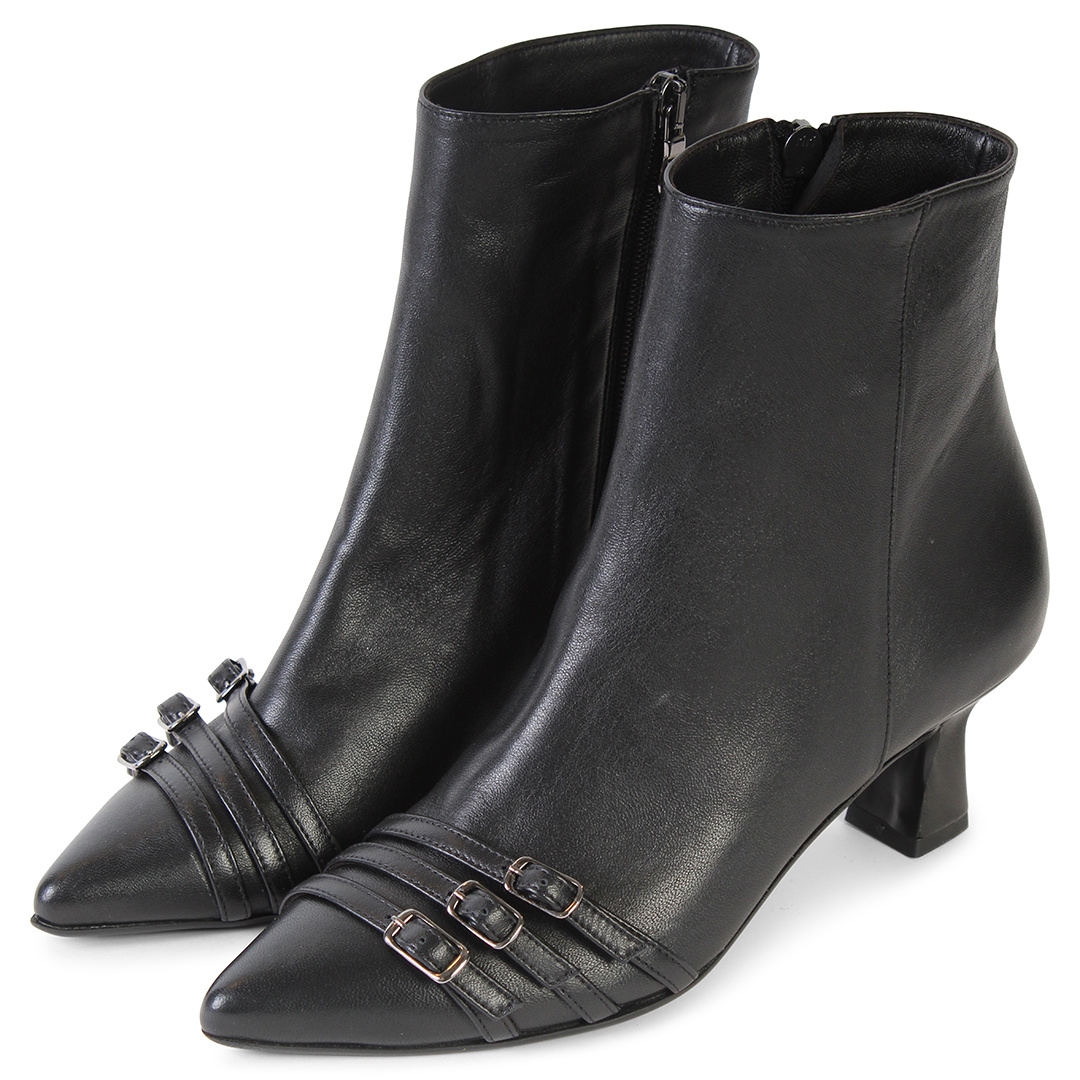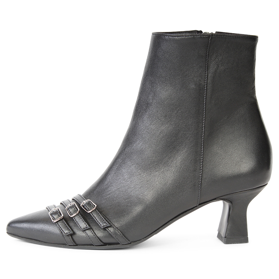 Ga voor stijl en comfort met enkellaarsje NOA. Dit trendy model is uitgevoerd in soepel zwart nappa leer en voorzien van drie subtiele riempjes op de neus