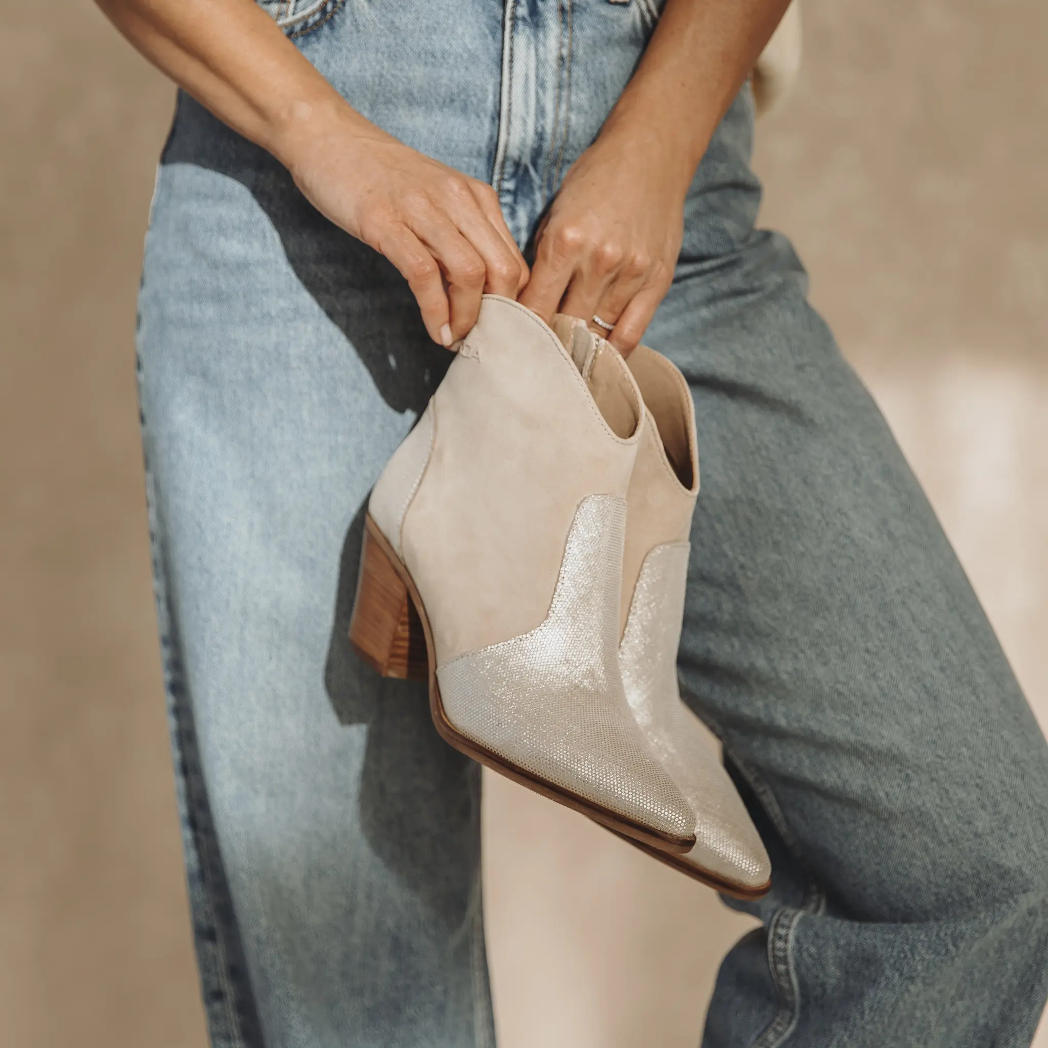 De PIRE is een stijlvol kort laarsje met een krachtige en elegante uitstraling. Dit model combineert verschillende materialen voor een verfijnd effect: de neus is uitgevoerd in beige print leer met een subtiele vleug goud, terwijl de schacht is gemaakt van zacht beige suède. Die mix geeft de PIRE net dat extra luxe detail.