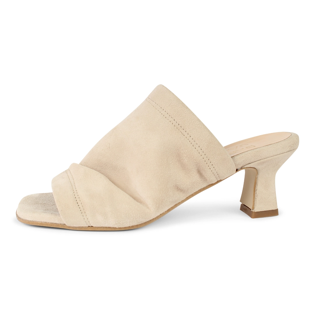 Beige suède mule PLAGE met stabiele queenie hak van 5 cm, elegant en comfortabel voor elke dag.