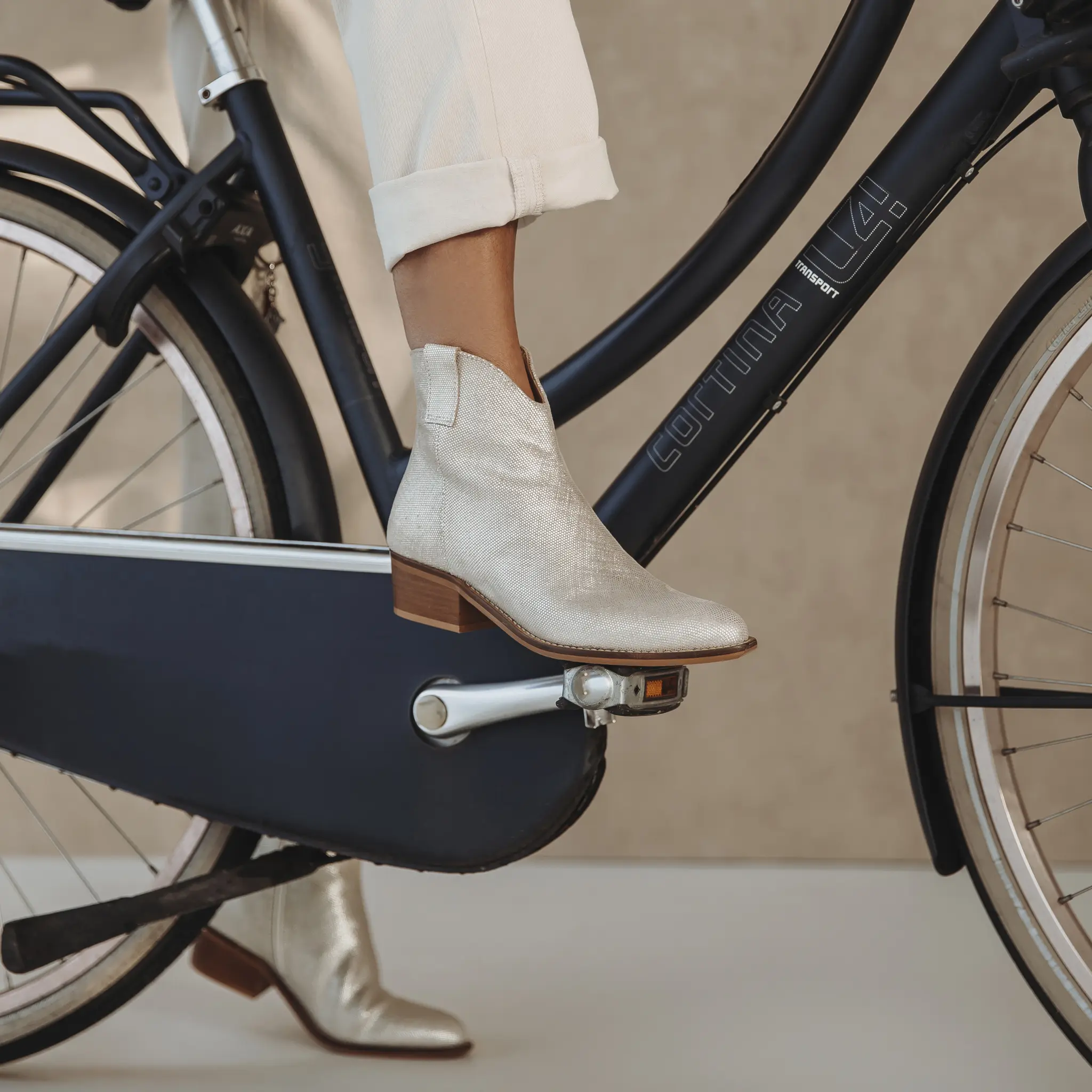 De PLATA is een elegant kort laarsje uitgevoerd in luxe beige-gold print leer, hetzelfde verfijnde materiaal als bij de RUBI. De subtiele metallic print geeft dit laarsje een chique, moderne uitstraling die moeiteloos te combineren is met zowel casual als geklede looks.