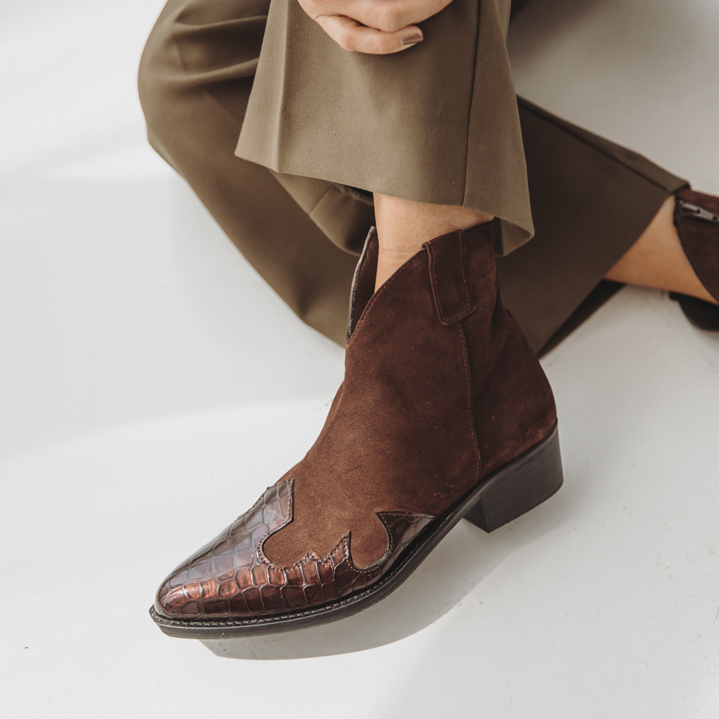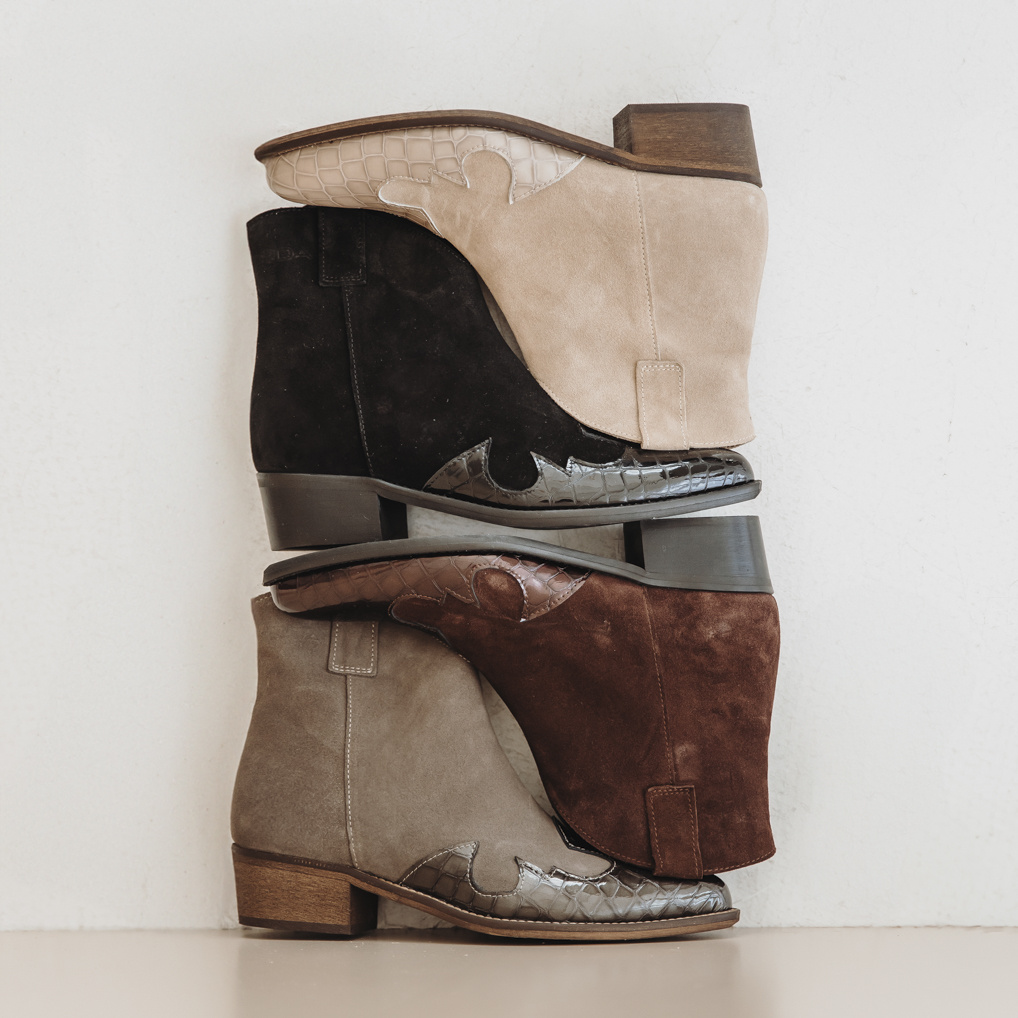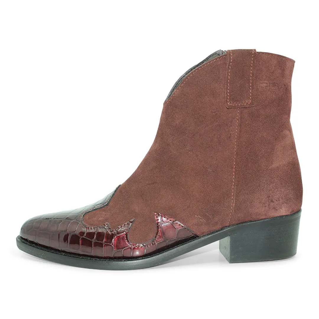 POOL BORDO is een elegant enkellaarsje met een rijke uitstraling, perfect voor het najaar. De neus is uitgevoerd in glanzend bordeaux croco lakleer, gecombineerd met een schacht van zacht bordeaux suède. Deze ton-sur-ton mix geeft het laarsje een luxe, diepe kleur en een verfijnde uitstraling.