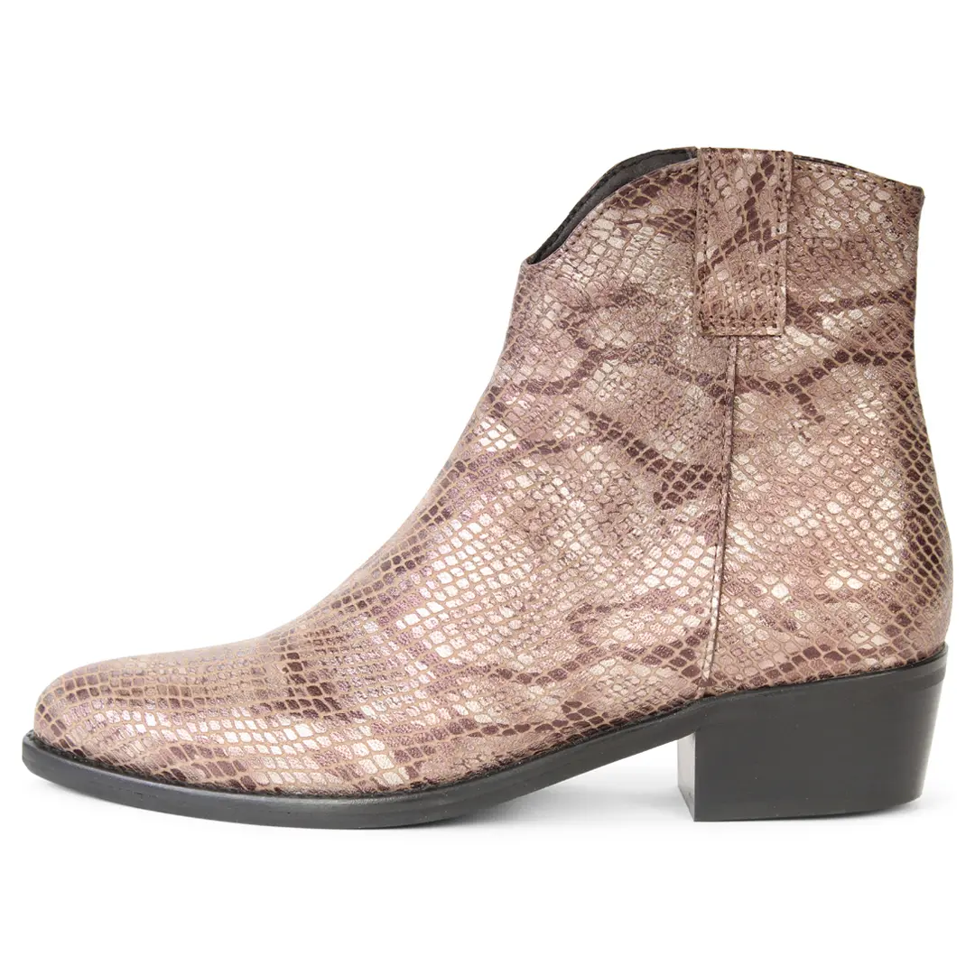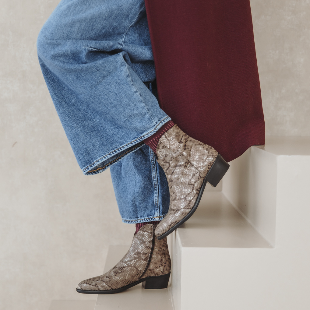 Ontdek het comfort en de klasse van RINO CROCO TAUPE – een stijlvol enkellaarsje met een iets lagere hak Lees meer