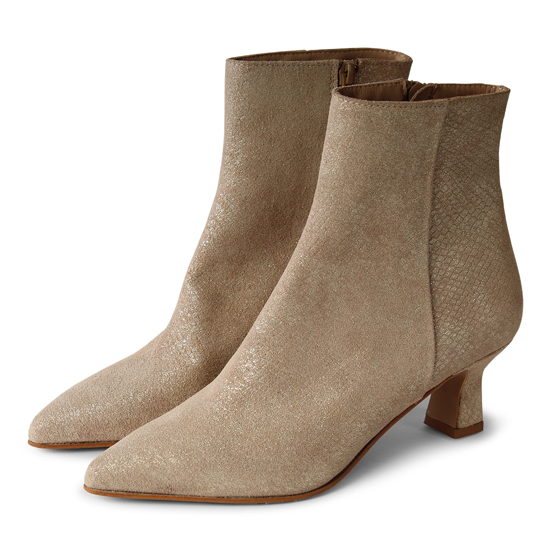 ROMA in beige suède print – elegant laarsje met uitneembaar voetbed en stabiele 5 cm hak. Trendy en comfortabel voor elke gelegenheid.