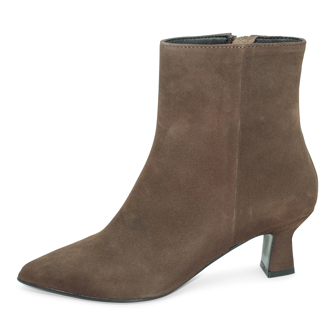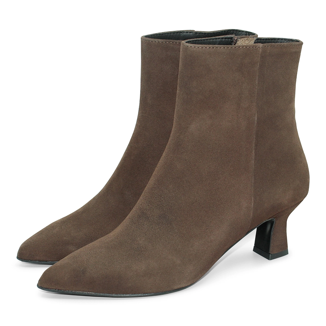 ROMA in bruin suede print – elegant laarsje met uitneembaar voetbed en stabiele 5 cm hak. Trendy en comfortabel voor elke gelegenheid.