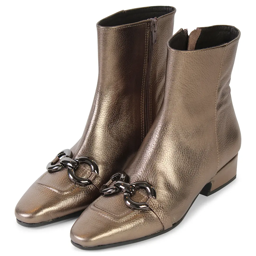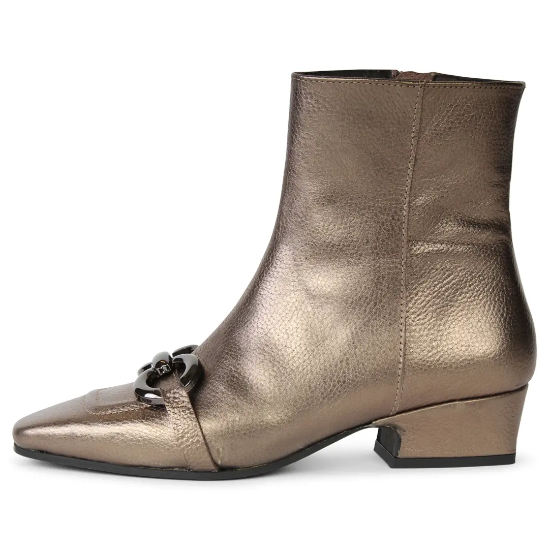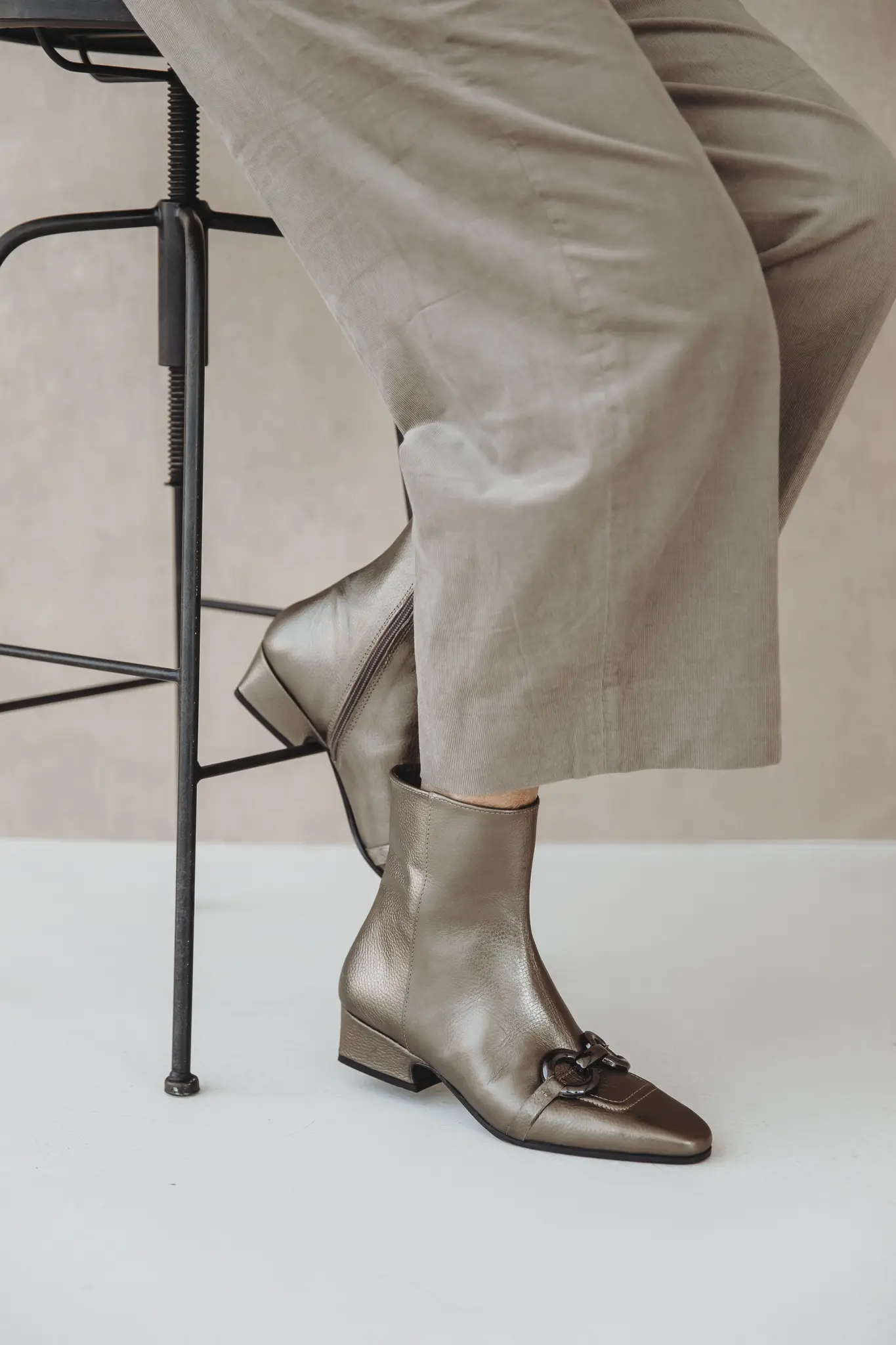 Deze elegante enkellaars Art Tess Bronze is een perfecte mix van comfort en verfijnd Italiaans design. Gemaakt van soepel metallic leer en afgewerkt met een subtiel accessoire op de neus, is dit laarsje een stijlvolle aanvulling op elke garderobe.