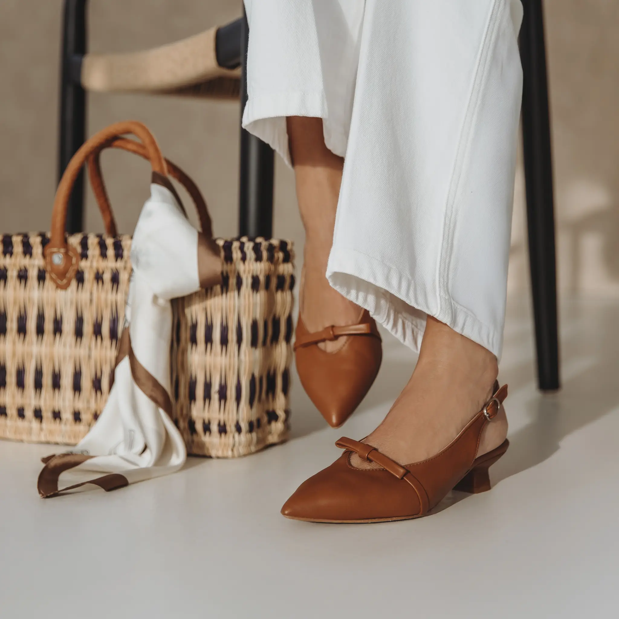 TIMBO BROWN slingback in zacht lichtbruin cognac leder, 3 cm queenie hak en elastisch detail. Elegant, comfortabel en valt normaal op maat. Lees meer
